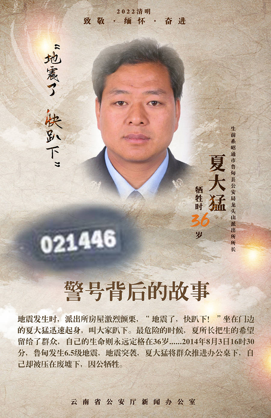 “地震了,快趴下!”2014年8月3日16时30分,鲁甸发生6.5级地震,地震突袭,夏大猛将群众推进办公桌下,自己却被压在废墟下,因公牺牲,他的生命永远定格在36岁……