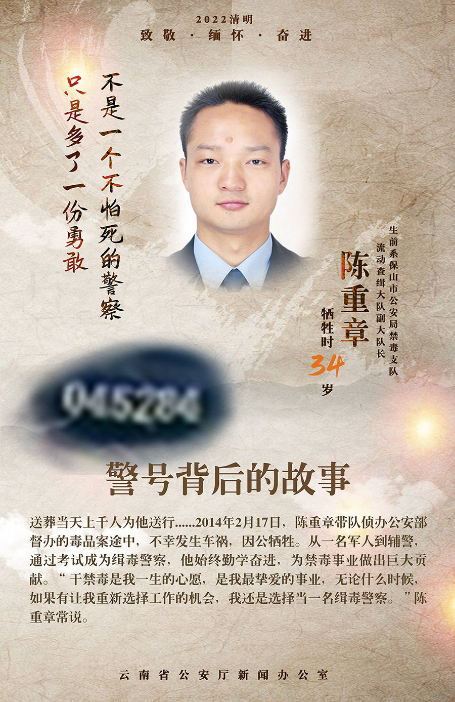 送葬当天上千人为他送行……2014年2月17日,陈重章带队侦办公安部督办的毒品案途中,不幸发生车祸,因公牺牲。从一名军人到辅警,通过考试成为缉毒警察,他始终勤学奋进,为禁毒事业做出巨大贡献。“干禁毒是我一生的心愿,是我最挚爱的事业,无论什么时候,如果有让我重新选择工作的机会,我还是选择当一名缉毒警察。”陈重章常说。