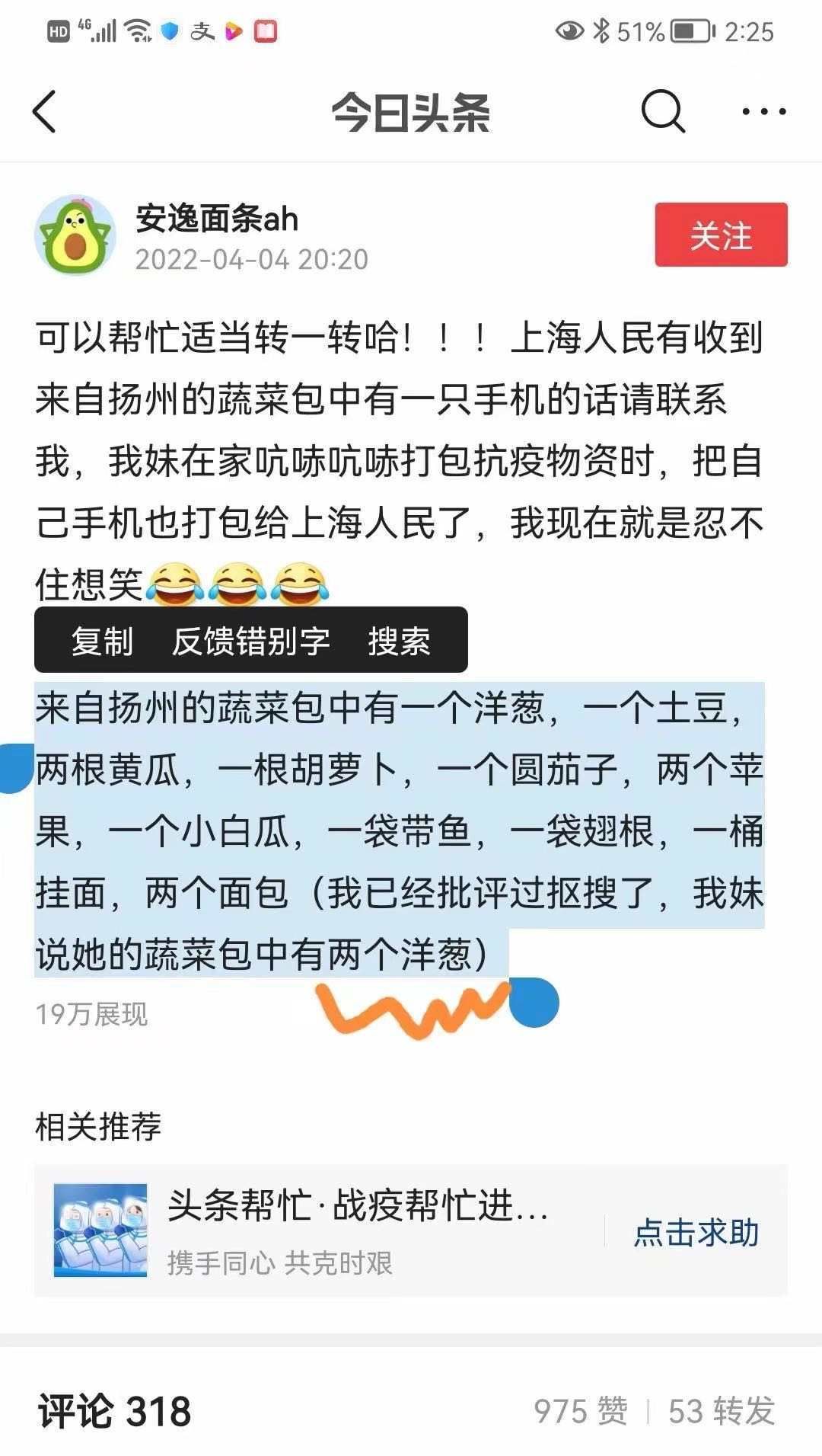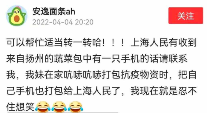 4月4日晚上8点,一位名叫“安逸面条ah”的网友在今日头条发布了一条求助信息:“上海人民有收到来自扬州的蔬菜包中有一只手机的话请联系我,我妹在家吭哧吭哧打包抗疫物资时,把自己手机也打包给上海人民了。”4月5日下午2点,一位名叫“半斤16两”的网名在评论区留言:“朋友,你妹妹的手机找到了,坐标闵行区虹桥镇兰竹居委会,已经交给居委啦,感恩你们!”