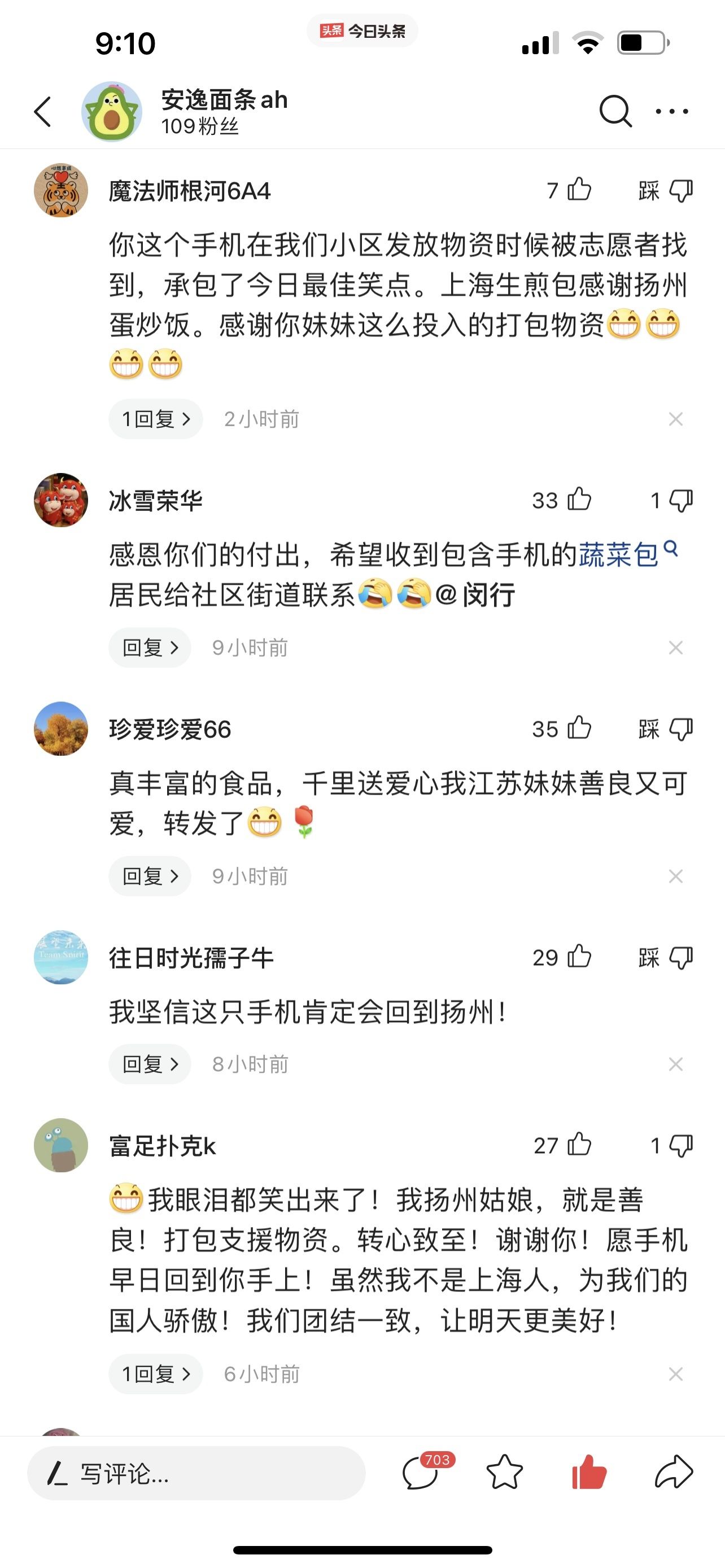 回贴者“半斤16两”告诉记者,社区群里转发寻机帖子后,有人说有个“手机盲盒”在蔬菜包,整个龙柏片区都在找这个手机,“就像一场接力赛”,大家都希望不要让这位疫中送菜的扬州小妹妹难过。还有人还在评论里安慰:给个地址,上海人民给你买个新手机。知道找到手机后,大家又在评论区里开起了玩笑:让居委出个证明,证明手机自己来的,主人没来,以免黄码。
