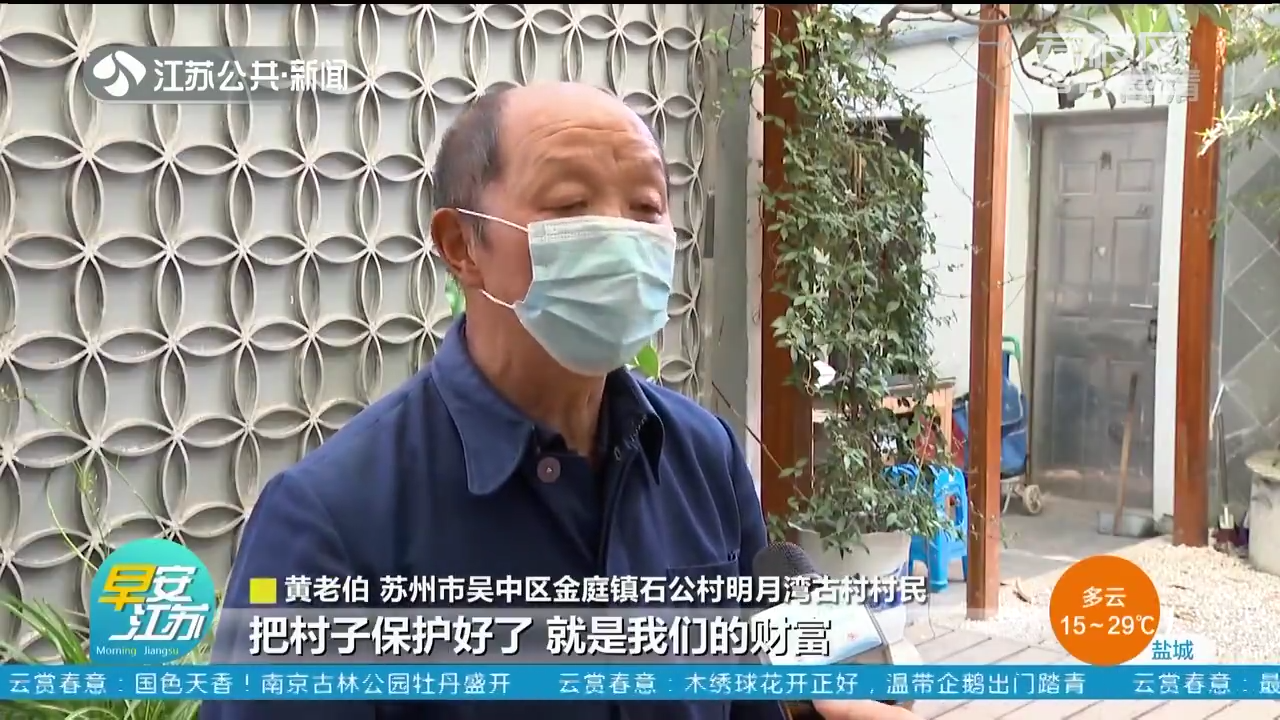 苏州市吴中区金庭镇石公村明月湾古村村民黄老伯说:“一部分房子租给人家做民宿,自己又是可以得一笔钱,这个大约每年6万元左右,农副产品可以销掉一点,把村子保护好了,就是我们的财富。”