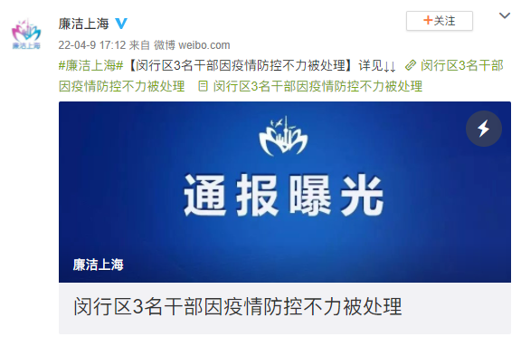 据@廉洁上海 微博公众号消息,上海闵行区3名干部因疫情防控不力被处理。