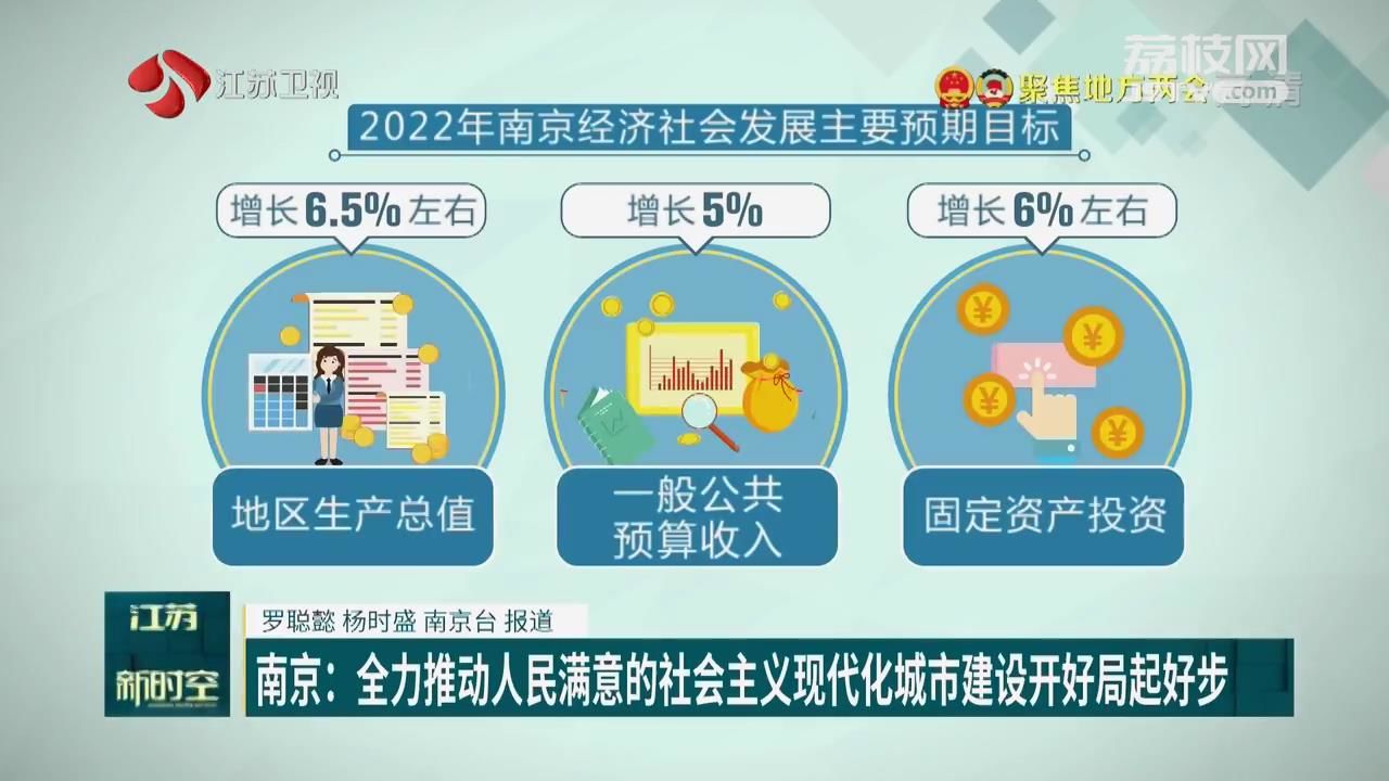 2022年,南京经济社会发展主要预期目标是:地区生产总值增长6.5%左右,一般公共预算收入增长5%,固定资产投资增长6%左右,全社会研发经费支出占GDP比重达3.7%,全体居民人均可支配收入与经济增长同步。