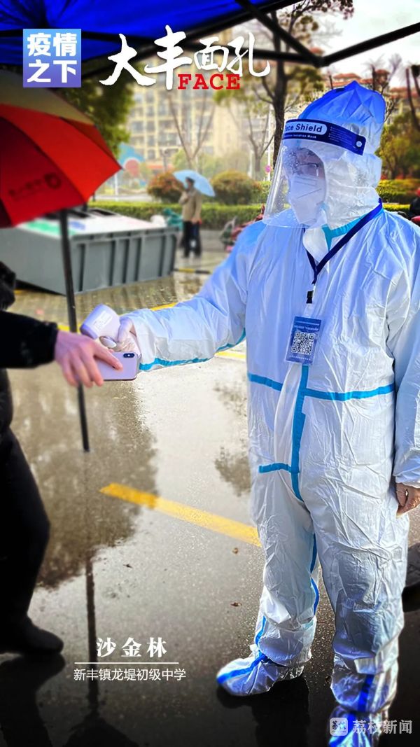 新丰镇龙堤初级中学副校长沙金林积极加入志愿者队伍,深入社区,身穿厚厚的防护服负责核酸等候区测温扫码,引导居民保持距离,在风雨交加的室外一待就是六七个小时,来得最早、走得最晚。