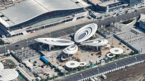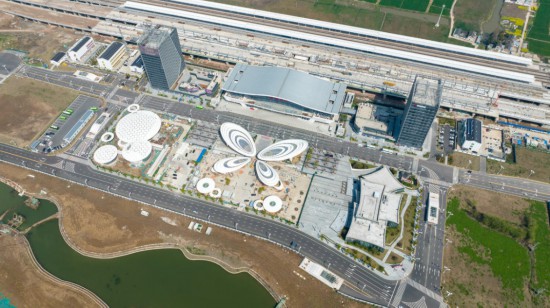 站前广场是张家港站建设的重要组成部分,整体以“化茧成蝶”为设计主题,南侧为展示中心,北侧为游客中心,建成后将成为我市新的城市展示窗口。
