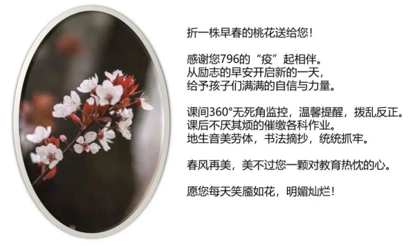 同学们走出家门,惊喜地发现,“虽然在疫情之下,但苏州的春天已悄然而至。”初二年级同学杨淑华则在随后的班会课上告诉大家,“要在细碎的美好中,感受时间的温柔。”还有同学折桃花送给老师:“感谢您‘796’的‘疫’起相伴……春风再美,美不过您一颗对教育热忱的心。”
