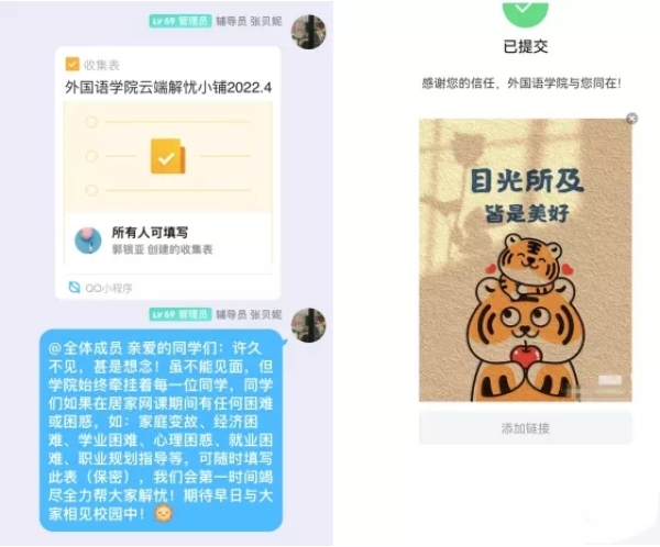近期,由常熟理工学院外国语学院辅导员“三点伴”工作坊打造的“云端解忧小铺”受到了同学们的欢迎。“小铺”以在线收集表的形式,收集整理学生的各类困难与烦恼,班主任、辅导员时刻关注着学生的情况,认真倾听每一位学生的心声,第一时间帮助学生解忧,缓解学生焦虑情绪。