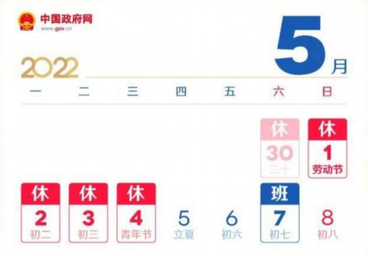 根据《国务院办公厅关于2022年部分节假日安排的通知》,2022五一放假为:4月30日至5月4日,放假调休共5天。4月24日(星期日)、5月7日(星期六)为正常工作日。