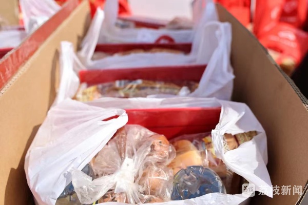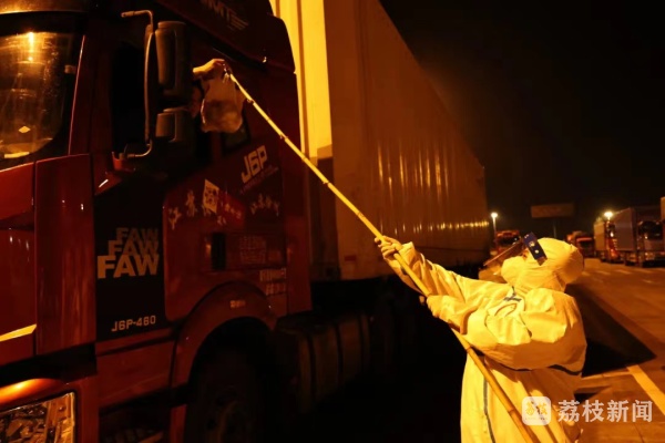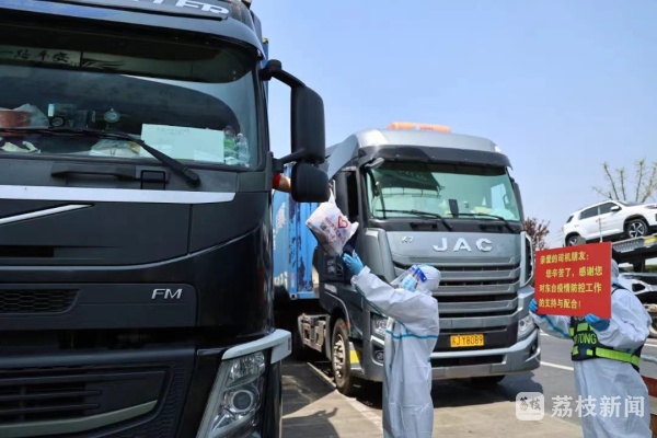 4月9日中午,太阳炙烤着黑色的高速公路,G15沈海高速东台服务区停车场上,停了不少待发的大货车。一支穿着防护服、戴着隔离面屏的志愿者队伍为这些卡车司机送上600份“能量补充包”。包里不仅有茶叶蛋、面包、纯净水等司机们急盼的食品,而且还细心配备了体温计、面纸、垃圾袋及医用外科口罩等物资。