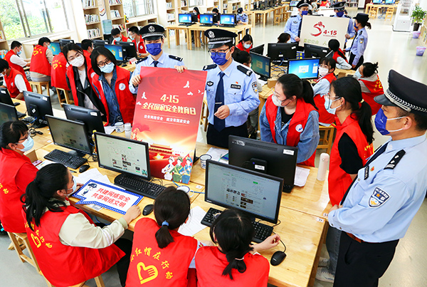 图为4月12日,民警在江苏陶都中等专业学校开展网络安全教育有奖竞猜活动
