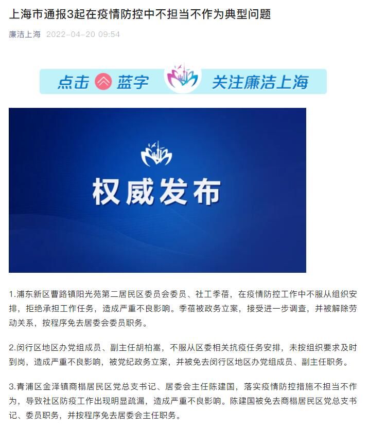 我苏网讯 据“廉洁上海”微信公众号消息,上海通报3起在疫情防控中不担当不作为典型问题,详情如下: