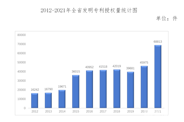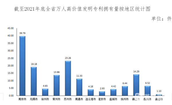 2021年,江苏知识产权创造主要指标再上新台阶。全省专利申请量751654件,专利授权量640917件;PCT专利申请量7168件;万人发明专利拥有量达41.17件,连续6年保持全国省区第一,每万人口高价值发明专利拥有量13.99件,是全国平均的1.87倍;在第二十二届中国专利奖评选中我省获专利金奖5项、外观设计金奖1项,占金奖总数的15%,同时获得最佳组织奖,实现历史性突破。