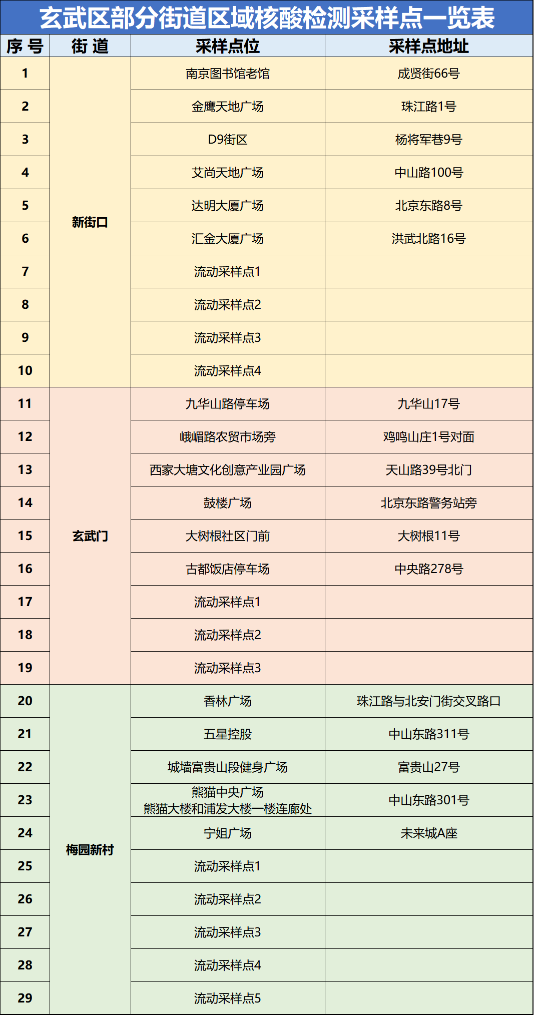附表:新街口街道、玄武门街道和梅园新村街道核酸检测采样点一览表