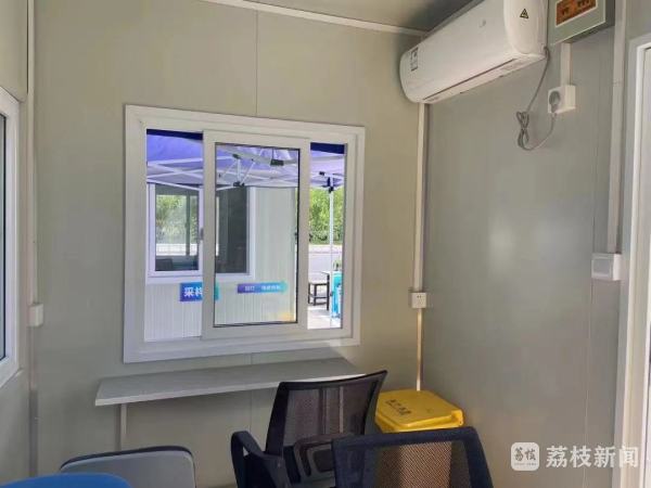 这间板房面积约5平方米,采取“模块化”的设计,在工厂内预先组装,省去现场搭建的时间,可快速落地使用。内部安装有配电设施能够满足4名核酸采样人员的工作、照明等需求,是一间设施更为健全的“采样驿站”。