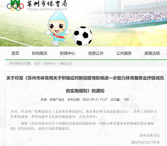 近日,苏州市体育局发布关于印发《苏州市体育局关于积极应对新冠疫情影响进一步助力体育服务业纾困减负的实施细则》的通知。