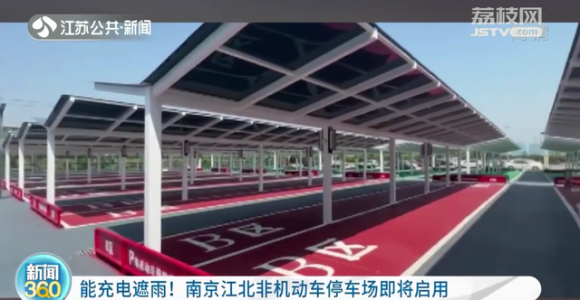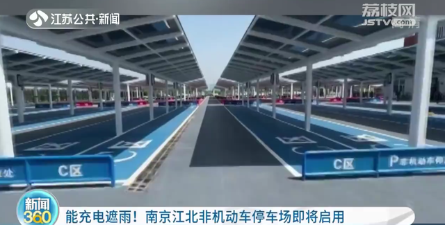 不仅有充电桩,还有遮雨棚,南京江北新区这个非机动车停车场配置齐全,堪称“豪华”版。