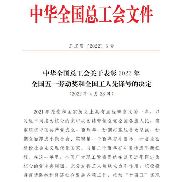 近日,中华全国总工会发布关于表彰2021年全国五一劳动奖和全国工人先锋号的决定,江苏那美实业有限公司自动单层封口班组获全国工人先锋号。