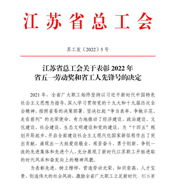 与此同时,江苏省总工会也发布了2022年江苏省五一劳动奖和江苏省工人先锋号的决定,江苏润阳光伏科技有限公司润阳设施班组获江苏省工人先锋号;江苏省杂技团团长、党支部书记吴其凯获江苏省五一劳动奖章。