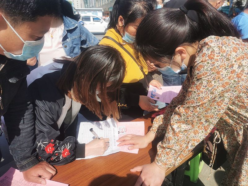 早上8点,前来应聘的求职者、咨询政策的群众络绎不绝。工作人员在严格做好疫情防控措施的同时,积极主动为求职者提供服务。