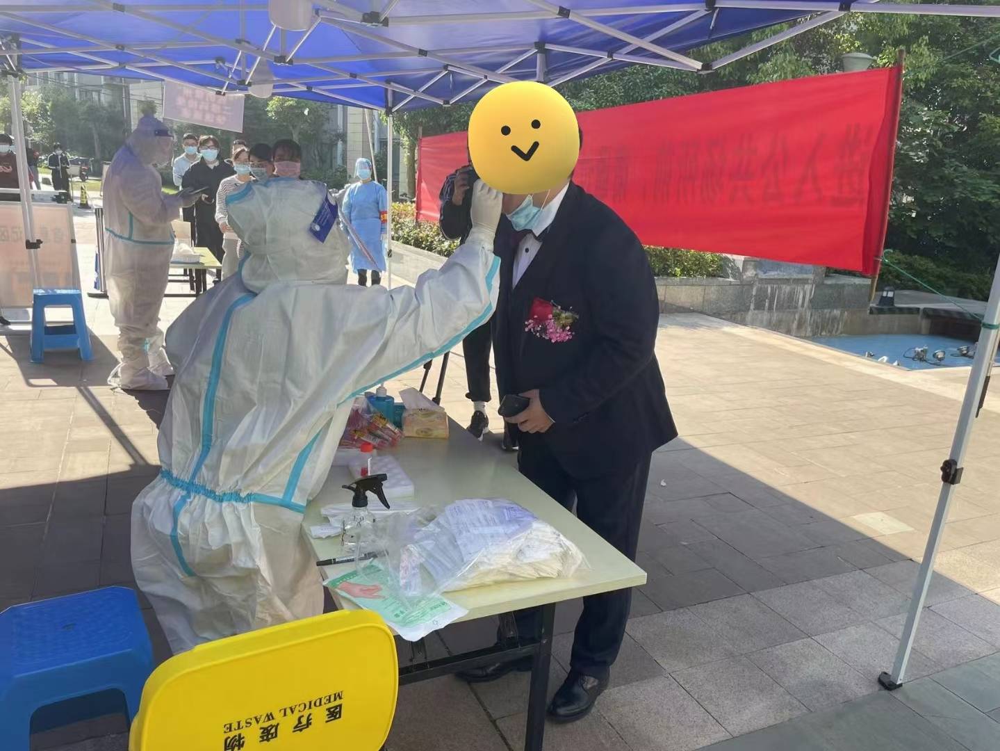 这也许是大家在特殊的时期对特殊好日子的新郎最有意义的祝福。检测完成后,新郎及家人散发喜糖,也是对大家祝福的回馈。