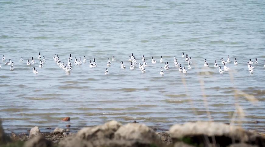 南京高淳山清水秀,拥有“天空之镜”美誉的石臼湖已成为众多候鸟的“打卡”之地。 鸟类是衡量一个地区生物多样性、生态质量的指标性动物。该作品以航拍的形式,首次抓拍到了成群的反嘴鹬在地铁s9号线附近翱翔的生动画面,展示出人与自然和谐相处、生物多样性保护带来的“惊鸿一瞥”盛景。