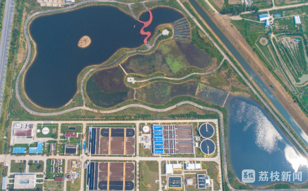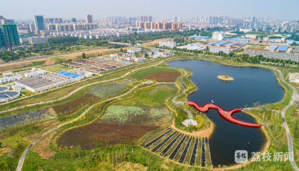 从空中俯瞰泗洪县,四四方方的城北污水处理厂被设计精巧、别致的湿地公园环抱,栽种在水中的铜钱草、鸢尾、水兰等水生植物在水中摇曳,从空中看去,色彩斑斓,让人赏心悦目。占地280余亩的湿地公园内,众多前来“打卡”的市民,正举着手机,对公园里的各色美景、古琴表演拍照,非常热闹。