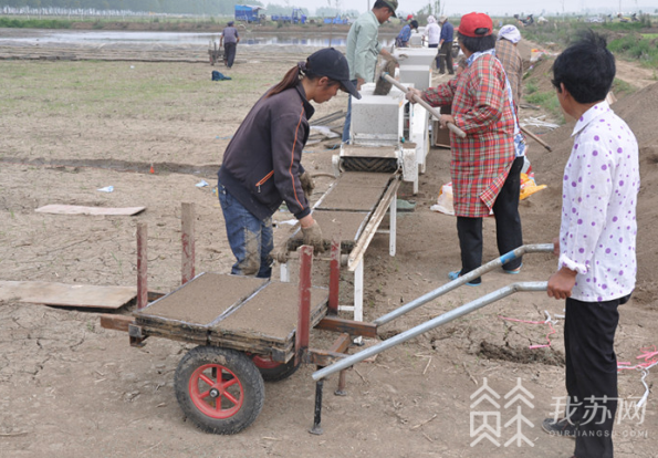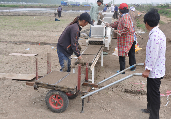 5月9日,在泗洪县一乡镇水稻育秧现场,一条水稻育秧生产线正开足马力生产,在10多名工人的配合下,经摆盘、覆土、盖籽等数道程序,一盘盘稻种不到10秒钟就育好了。