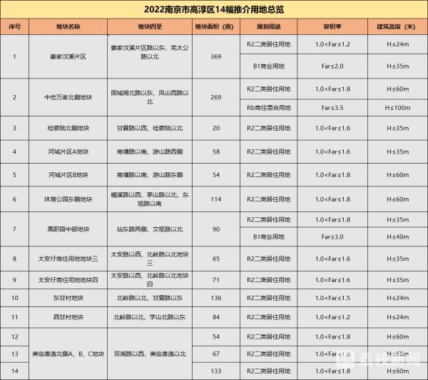 本次土地展上,高淳区共端出14幅优质地块,土地总面积1584亩,均为容积率低于2.0的低密地块。区域分布在高职园、经开区、太安圩等板块,周边生活配套完善。