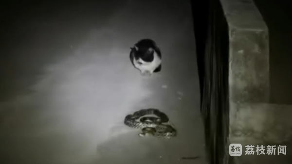 5月6日晚上,南通某小区附近河边,盘踞着一条一米长的蛇,消防救援人员赶到现场后发现,旁边还有一只小猫正紧紧盯着这条蛇,一动不动,上演了一场"龙虎斗"。最终,消防员用捕蛇器将蛇夹住,确认是菜花蛇后将其放生。