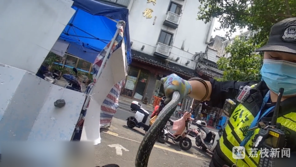 确定蛇的大致位置后,老板将店内的桌椅清空,民警和辅警两人配合开始抓捕,用抓捕钳将蛇头钳住之后,放入蛇皮袋内,随后把它放生到外秦淮河内。