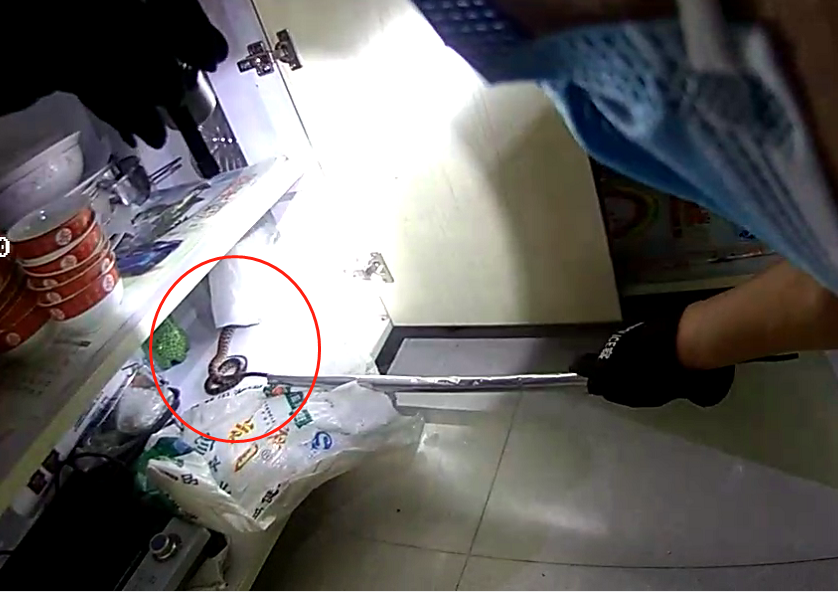 随后民警打开厨房所有橱柜,小心翼翼地挨个仔细翻找,10分钟后,在橱柜的一个角落里的白色塑料袋下面发现了一条带有红色纹理、长约1米的蛇。随后,一名民警为其照明,另一名民警一边用棍子死死按住蛇头,一边用手抓住蛇尾,小心将其向外拖,刚拖出来,民警正准备去抓其头部时,蛇挣脱了压着的棍子,凭着以往捕蛇的经验,民警眼疾手快迅速用棍子再次将蛇按在地上,紧接着抓住蛇的七寸,并把它放进了事先准备的编织袋中。王女士一家人见此终于松了一口气,他们对民警的帮助表示感谢。