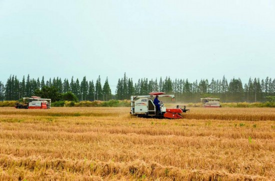 昆山张浦镇南姚村的一片农田里,小麦已完全成熟。麦穗金黄、颗粒饱满,3台联合收割机正在滚滚麦浪中往返收割。为使跨区作业人员及机具顺利进入当地,早从4月下旬起,张浦镇就启动了来昆跨区作业人员和机具预登记工作,制定夏收农机作业应急保障方案。