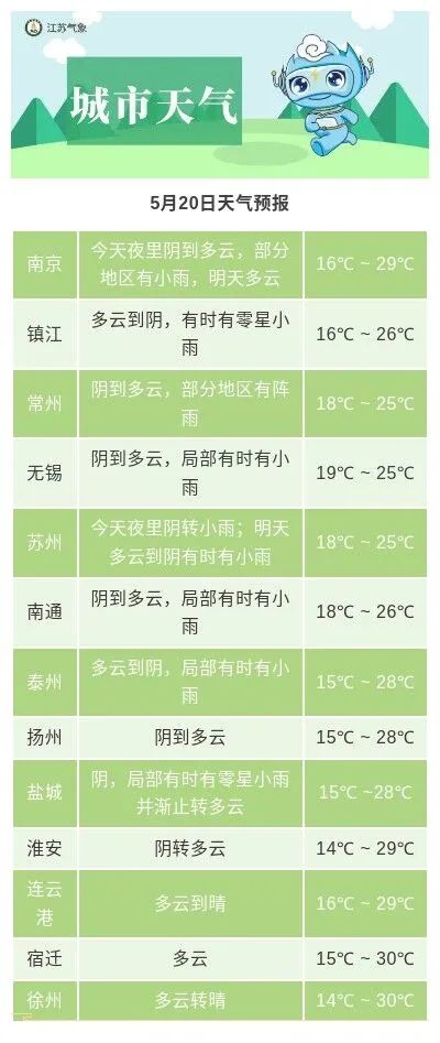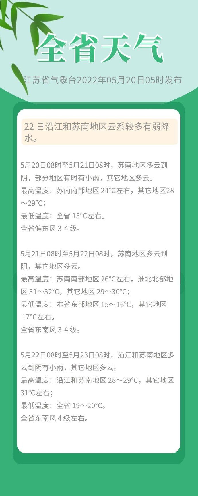 今天苏南地区多云到阴,部分地区有时有小雨,其它地区多云。最高温度:苏南南部地区 24℃左右,其它地区28~29℃;最低温度:全省 15℃左右。全省偏东风 3-4 级。
