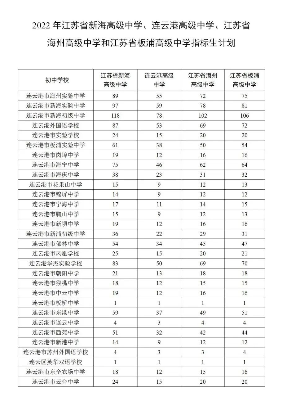 四星级普通高中统招计划全部作为指标生计划分配到初中学校(分配及推荐实施办法见附件2)。江苏省新海高级中学、江苏省海州高级中学、连云港高级中学和江苏省板浦高级中学指标生计划由市教育局核定,其他四星级普通高中指标生分配计划由所在县区教育部门确定,并报市教育局审核备案。