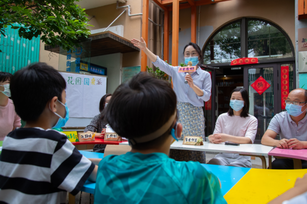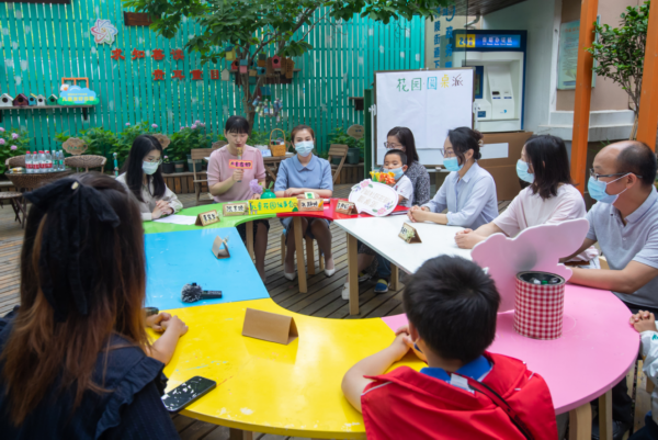 5月29日是周日,南京江宁区睦邻下墟儿童友好花园里热热闹闹,郁郁葱葱的大树下秋千架摇摇晃晃,小兔子蹦来蹦去。花园中央,五彩的小圆桌旁围坐了一圈“儿童议事员”,正叽叽喳喳和大人们一起讨论如何让这个“藏”在社区里的花园变得更可爱、更有趣。