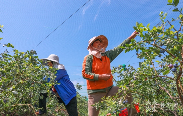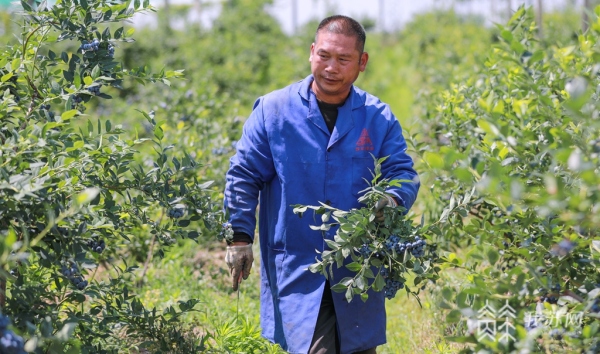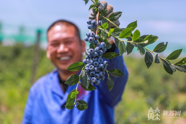 “你看,这蓝莓,是不是像葡萄一样,一串一串的……”,5月31日上午,当记者一走进江苏句容天王镇戴庄村蓝莓基地,蓝莓种植户方志强就开心地向我们介绍起他的蓝莓。方志强介绍,这种蓝莓的品种叫布里吉塔,虽然是老品种,但是他们今年在农业专家赵亚夫的指导下尝试采用新的蜜蜂授粉方式,让原本这个品种一颗一颗逐渐成熟的蓝莓变成了同一时间成熟,看起来就像葡萄串一样,这样不仅提前了采收的时间,还提高了口感。“原本是成熟一粒采收一粒,而像这样一串串成熟,我们采收的时候就可以像葡萄一样,一串串的剪下来,节省了大量的人工,节省了成本。”