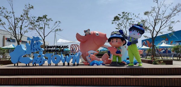 主题墙面彩绘装点下的欢墩美食城明艳活泼,石梁河文旅IP形象“石小海”“喵小良”在彩绘图案中以各种情境情节出现。在美食城房顶,骑着大鱼的石小海远眺着游人如织,甚是可爱;大渔海Town的地标雕塑,“喵小良”趴在巨鱼身上,随主人“石小海”乘风破浪。螃蟹等卡通图案组成的斑马线地面彩绘将游客沉浸式主题体验精确到“每一步”;“鱼府”“羊羊得意”“鱼东家”等特色餐饮店浓浓的地域风味。