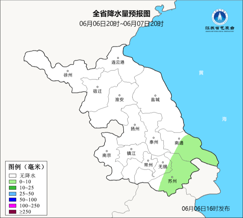 6月6日20时至6月7日20时,全省多云,其中本省东南部地区有阵雨或雷雨。