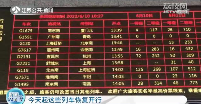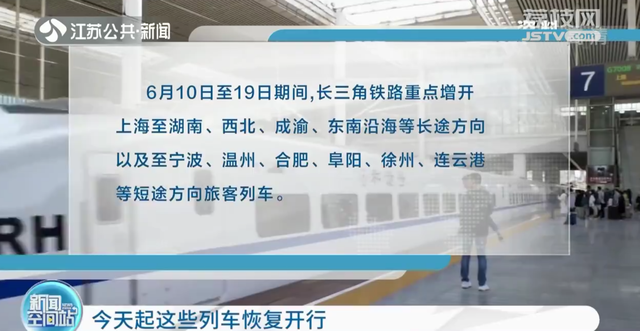其中,6月10日,上海地区恢复开行旅客列车37列,当天开行列车总数达106列。记者注意到,这些列车当中,很大部分都会经过江苏,有效提升沿线城市,包括苏州、南京、连云港、南通、徐州等地运能,让这些地方的旅客出行更加便捷。