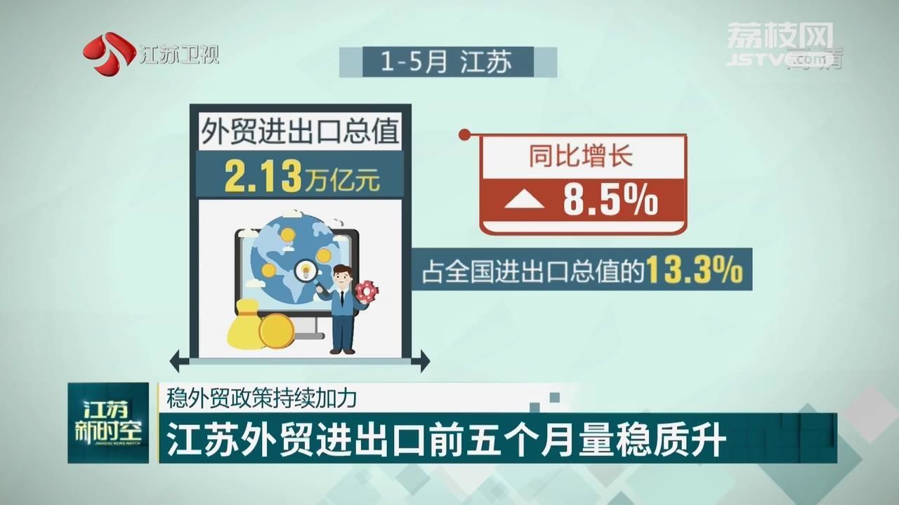 From January to May, Jiangsu reported a total import and export value of 2.13 trillion yuan, a year-on-year increase of 8.5%, accounting for 13.3% of the national total. Exports reached 1.32 trillion yuan, an increase of 9% and imports reached 807.03 billion yuan, an increase of 7.6%.