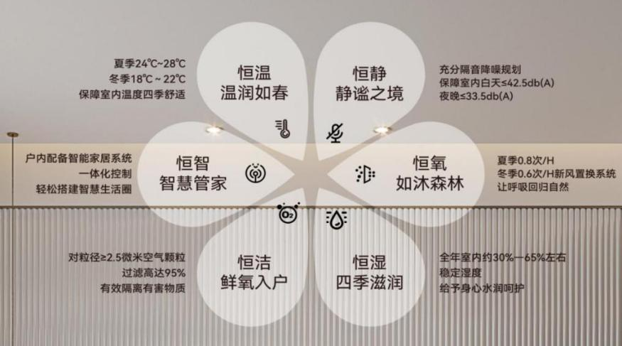 全屋采用“恒温、恒静、恒氧、恒洁、恒湿、恒智”六恒科技系统,引入恒温(地源热泵系统)、恒湿(温湿调节系统)、恒氧(置换新风系统)、恒静(系统窗隔音降噪)、恒智(智慧节能控制系统)、恒洁(新风除霾系统)在内的六恒科技住宅,为业主舒适健康生活保驾护航。