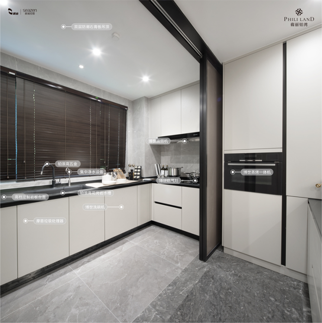地面选择了印记灰天然大理石材,代替传统瓷砖铺地面;厨房台面、玄关台面,全部严苛甄选高规格劳伦金黑色岩板,质感全面升级。