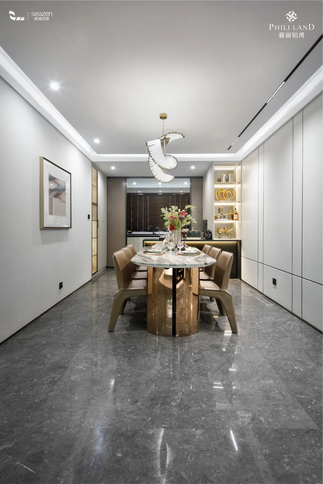翡丽铂湾以流畅动线贯穿观景区、沙发区、会餐区,打造LDKB超级巨厅成为互动交流的家庭磁场,完成一次全新的生活洞察,消融生活的边界。