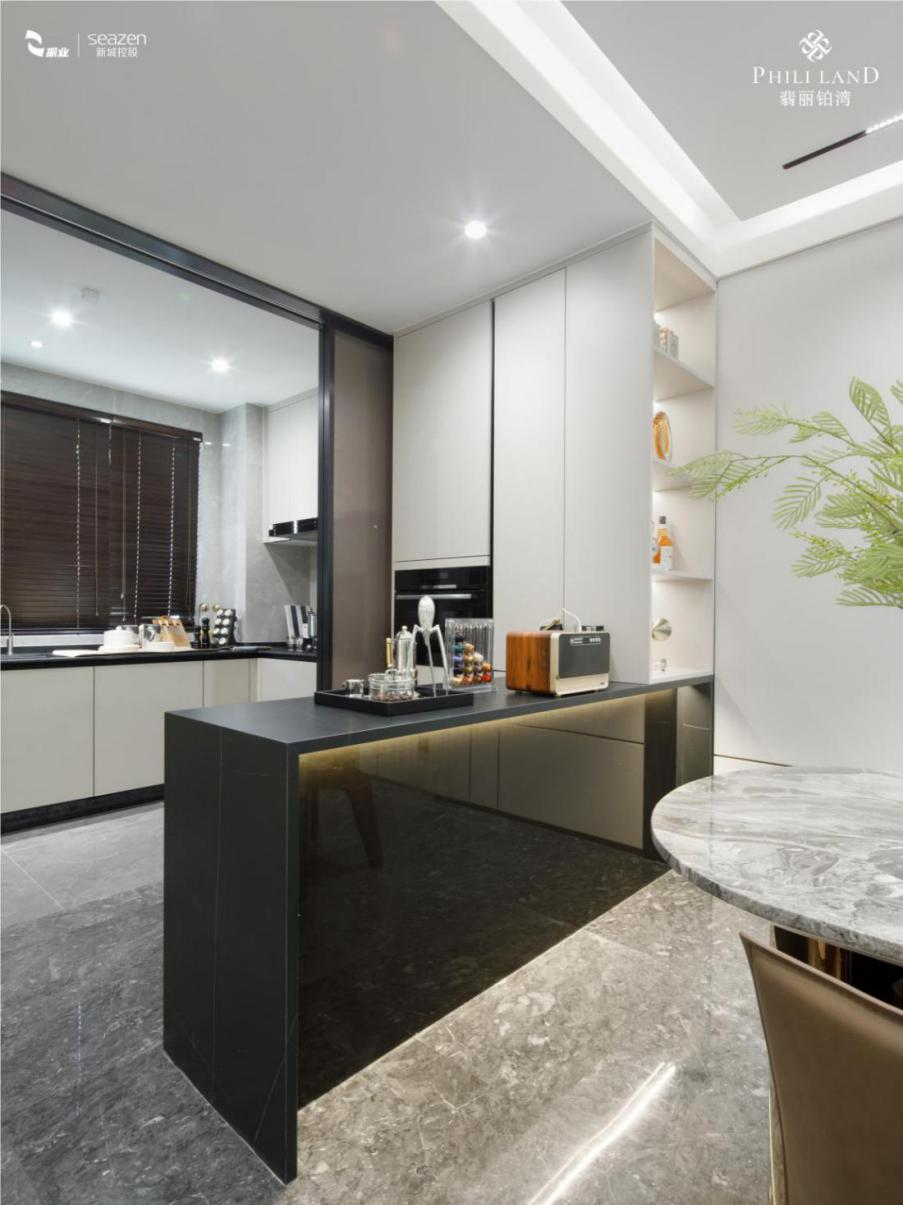 中西导台等开放式定制空间,区隔重油与轻餐,中厨、西厨与餐厅有机融合,成就居者日常生活的私趣领地。