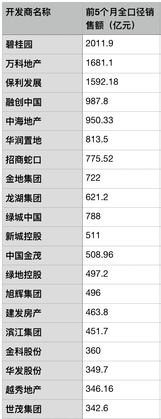 前5个月仅有3家房企销售额过千亿