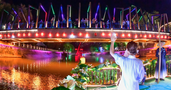 昨天(6月24日),记者从连云港市海州区了解到,随着各类促消费举措的推进,海州区“夜经济”快速复苏,民主路老街、陇海步行街、盐河古巷多个商业街区晚间人流如织。千年盐河古巷,水调清歌回荡。坐在古色古香的游船上,底下是泛起涟漪的河水,眼前是别样的海州夜景。