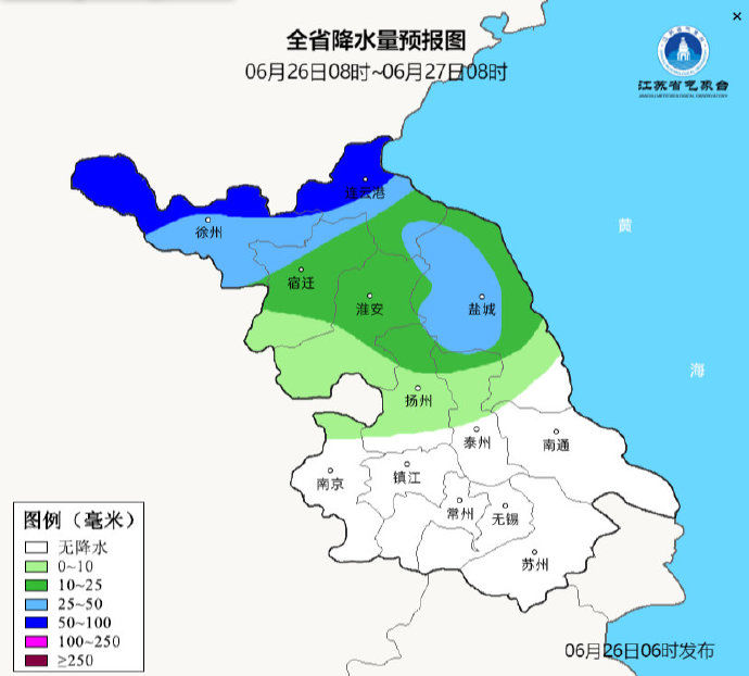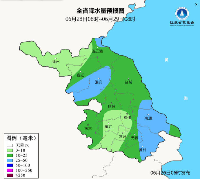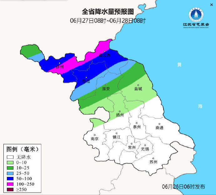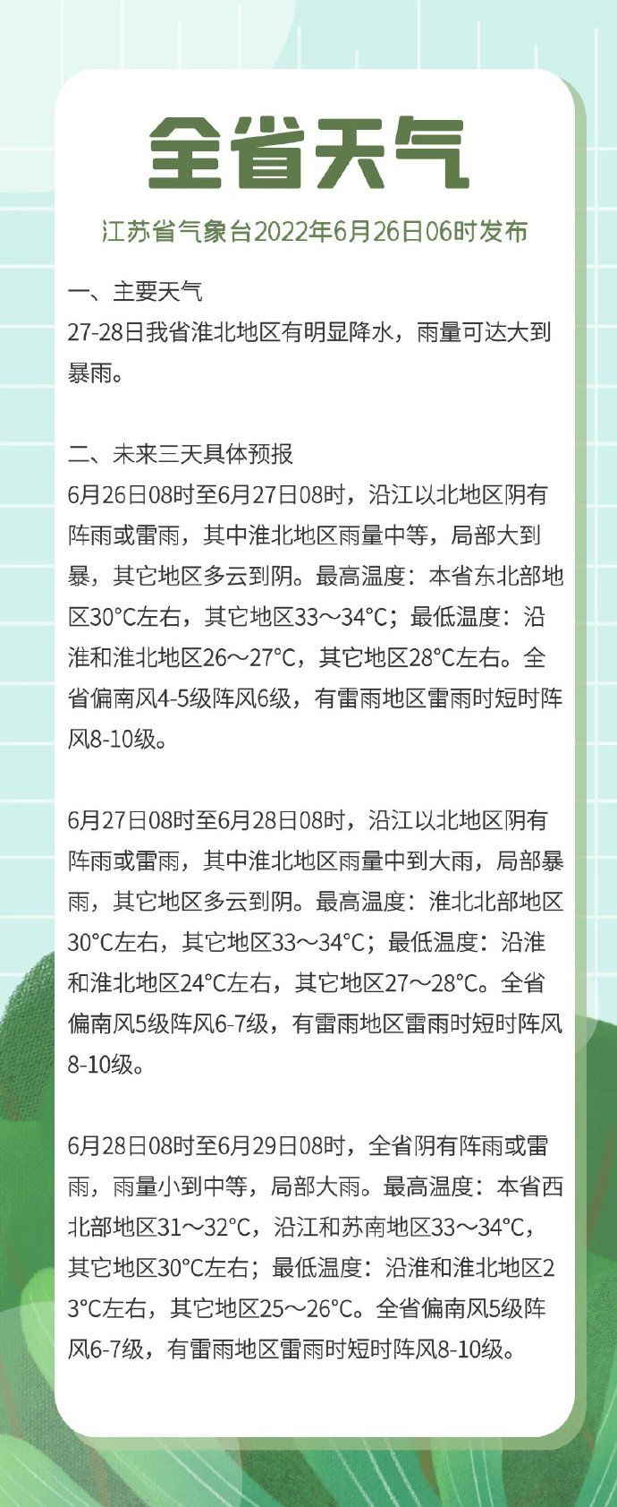 我苏网讯 据@江苏气象 官方微博消息,6月26日08时至6月27日08时,沿江以北地区阴有阵雨或雷雨,其中淮北地区雨量中等,局部大到暴雨,其它地区多云到阴。最高温度:本省东北部地区30℃左右,其它地区33~34℃;最低温度:沿淮和淮北地区26~27℃,其它地区28℃左右。全省偏南风4-5级阵风6级,有雷雨地区雷雨时短时阵风8-10级。
