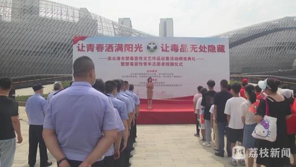 连云港市禁毒委员会办公室、连云港市公安局、连云港市教育局、共青团连云港市委员会以及连云港市广播电视台共同主办,2022年连云港市禁毒宣传文艺作品征集活动颁奖典礼暨禁毒宣传青年志愿者授旗仪式。从5月15日开始,面向全市各大中小学校学生以及社会各界青年开展2022年青少年禁毒宣传作品有奖征集活动。截止6月15日,共收到原创短视频两百多件,原创文艺作品两千多件。活动现场为原创短视频大赛和原创文艺作品大赛获奖选手以及禁毒宣传优秀组织奖获奖学校和指导教师颁奖,并举行2022年连云港市禁毒宣传进万家——青年志愿者在行动启动仪式。市禁毒支队在活动现场设置了展台,向市民展示各种毒品的原料、成分、伪装样式等等,并向市民发送宣传手册,现场接受咨询。
