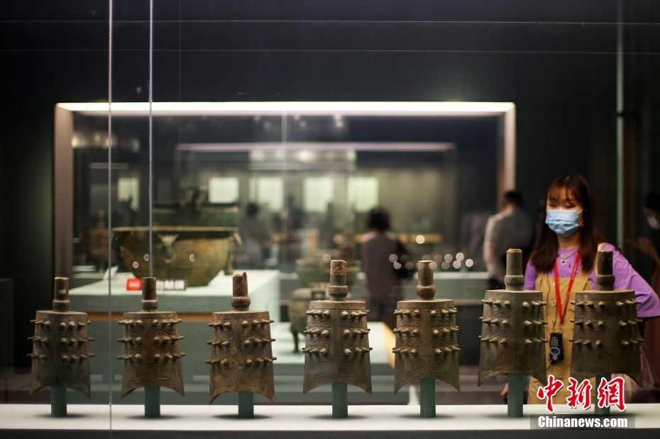 图为展出的夔龙纹编钟吸引观众的目光。
