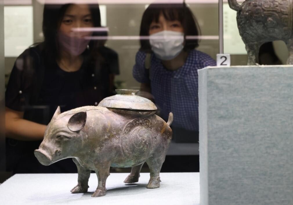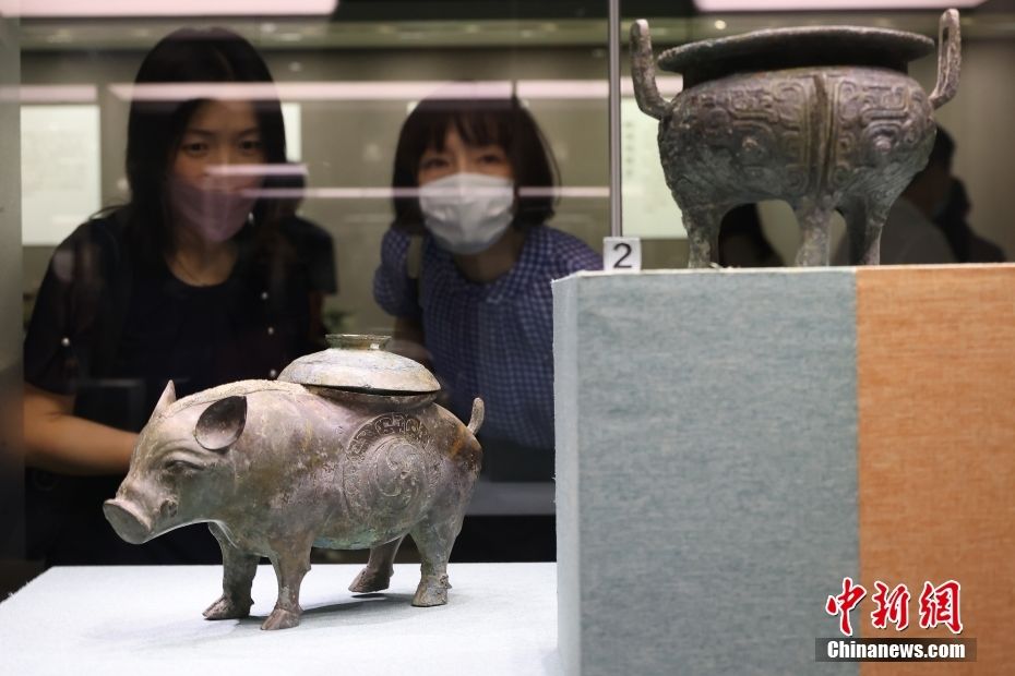 图为展出的猪尊(左)、兽面纹鬲(右)。